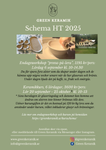 Hem Välkommen till Green Keramik! Green Keramik finns i Söderhamn och verksamheten fokuserar på bruksföremål i stengods. Följ mig på Facebook och Instagram för uppdateringar om vad som händer i verkstaden. Produktutveckling sker löpande. Schemat för höstterminen är nu upplagt! Se kursschema för mer information.